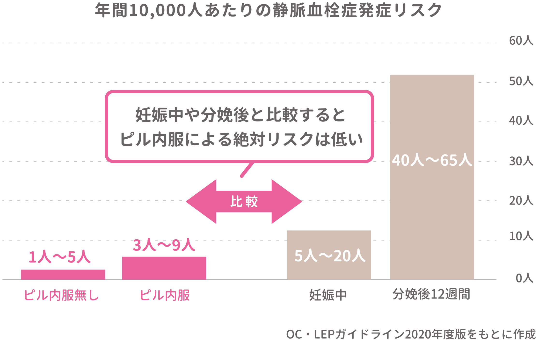 重大な副作用として血栓症(血管の中で血液が固まってしまい、血液が流れなくなる病気)がありますが、基礎疾患のない非喫煙者では稀な副作用です。妊娠中や分娩後と比較すると、ピル内服による絶対リスクは低いことが分かります。